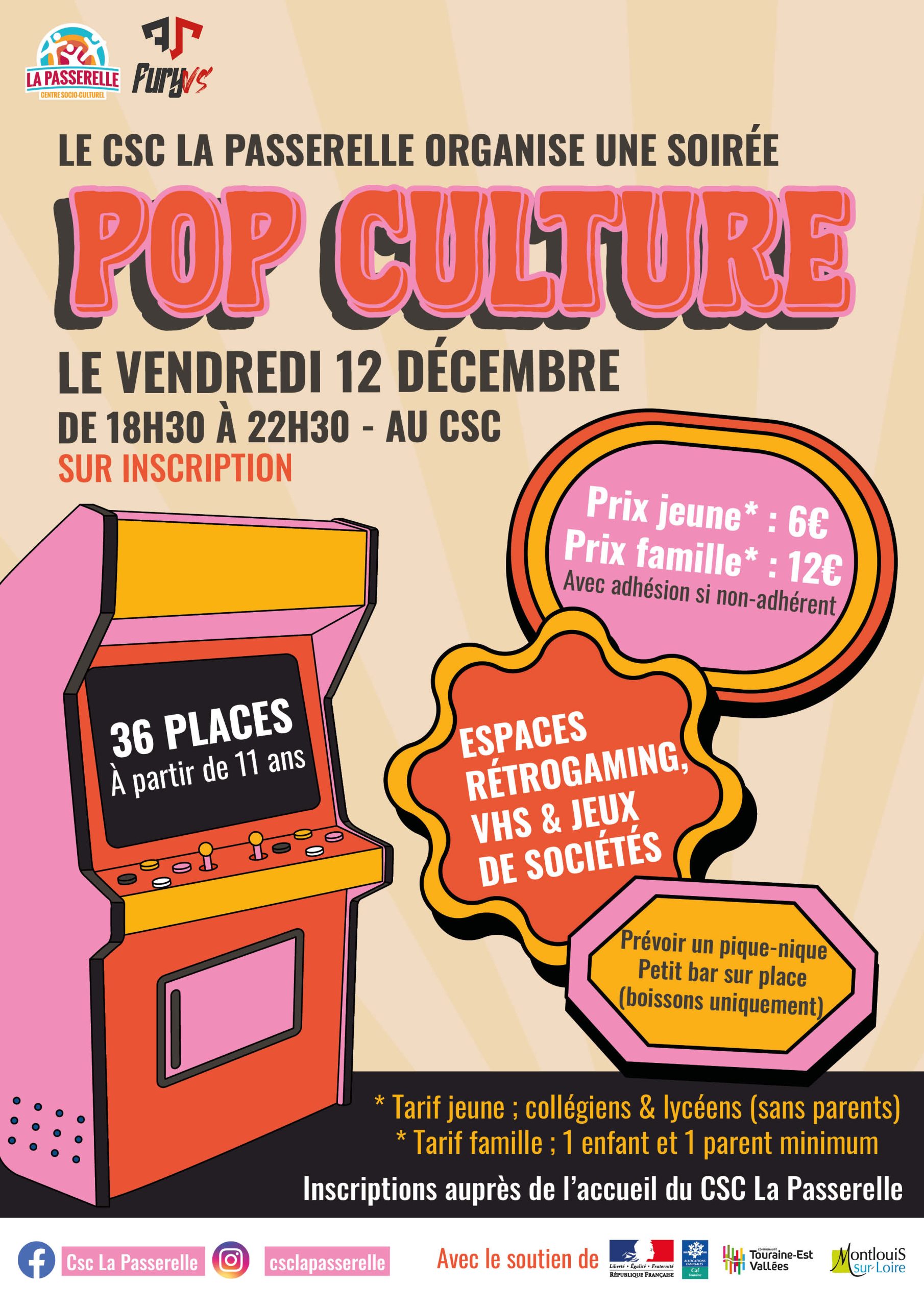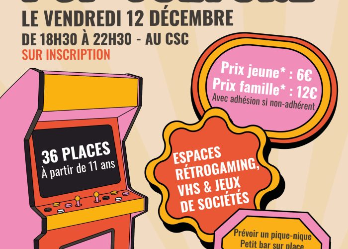 Une soirée pour jouer ensemble ! 👾Ambiance 100% rétro ! Au programme :🕹️Espace rétro-gaming, avec Fury Lan📼Coin VHS à l’ancienne🎲 Des jeux de société pour tous les âges Vendredi 12 décembre – Au CSC La Passerelle – 18h30 à 22h30