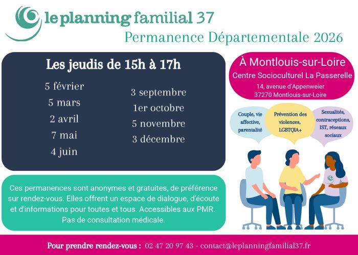 À partir du jeudi 5 février 2026, retrouvez les permanences proposées par le Planning Familial 37 au CSC La Passerelle 📣