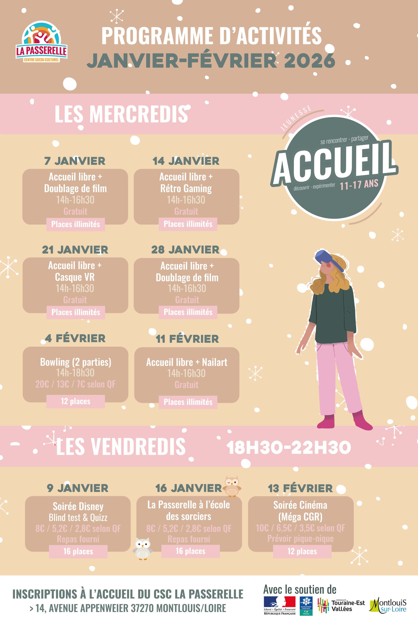 Retrouvez le programme hors vacances pour les 11-17 ans> Le mercredi, maintenant c’est accueil libre gratuit ! (sauf pour les sorties)> Inscriptions auprès de l’accueil du CSC