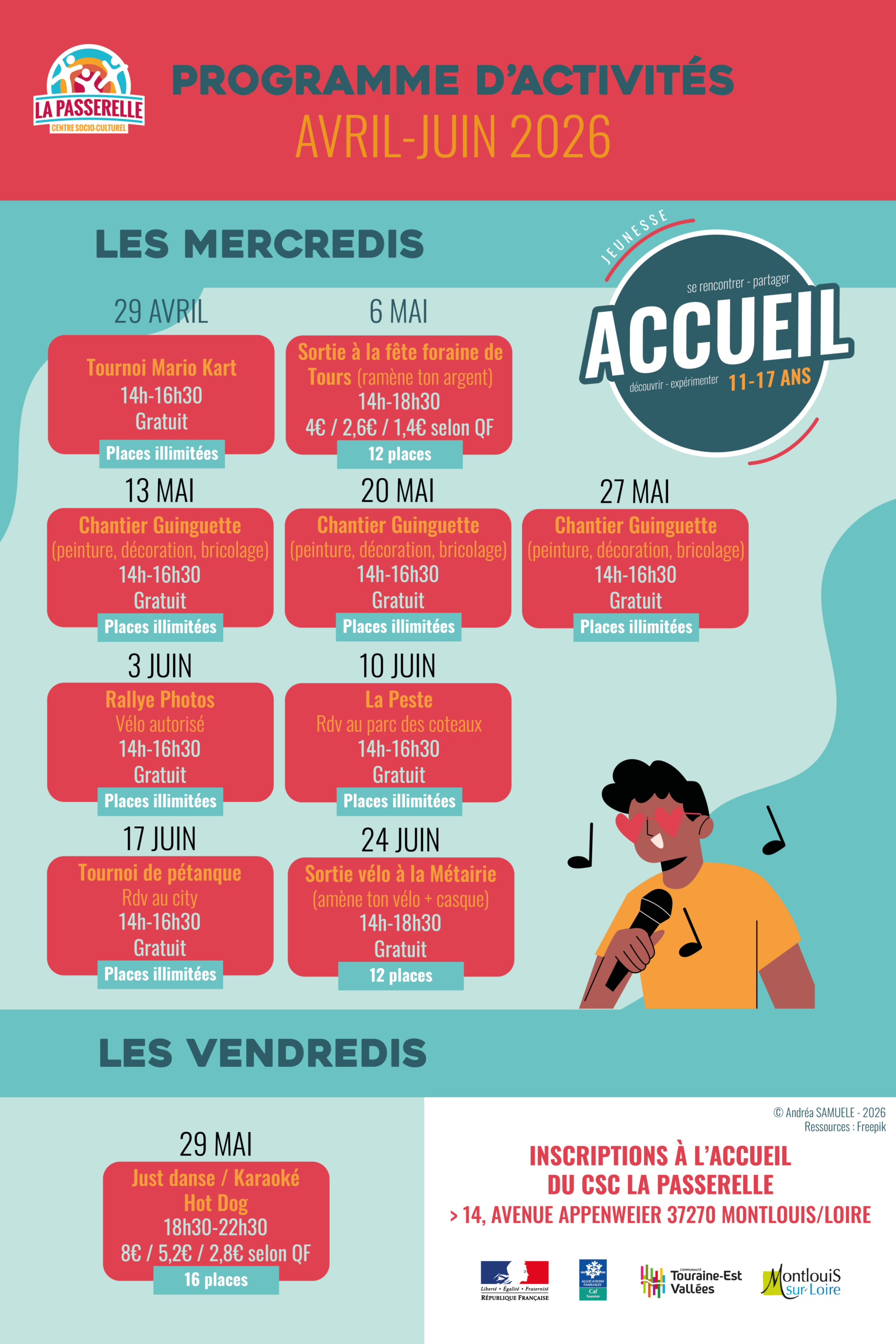 Voici le programme d’activités sur la période avril-juin pour les 11-17 ans Inscriptions auprès de l’accueil du CSC La Passerelle