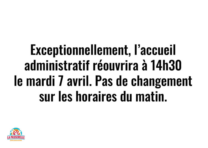 Pour information, au vu du nombre de passages nous changeons nos horaires d’ouverture du mardi. L’accueil sera ouvert de 10h à 12h30, puis de 14h à 18h30 🔔 À bientôt 🤗