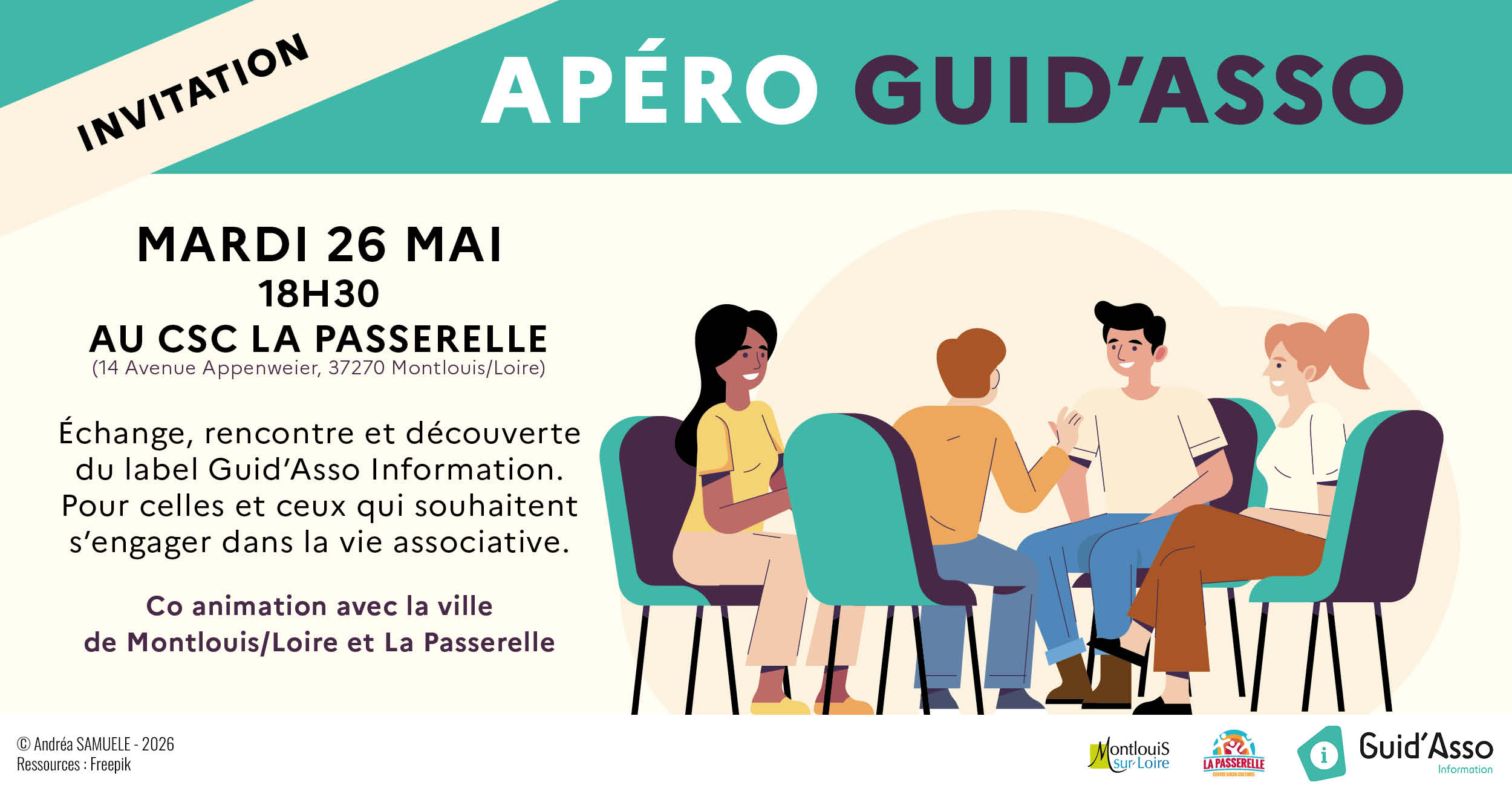 Apéro Guid’Asso / 26 mai 28 avril 202628 avril 2026 Envie d’en savoir plus sur Guid’Asso ? Rendez-vous le mardi 26 mai à 18h30 à La Passerelle pour un moment convivial autour de la découverte du label Guid’Asso Information Ouvert à toutes et tous !