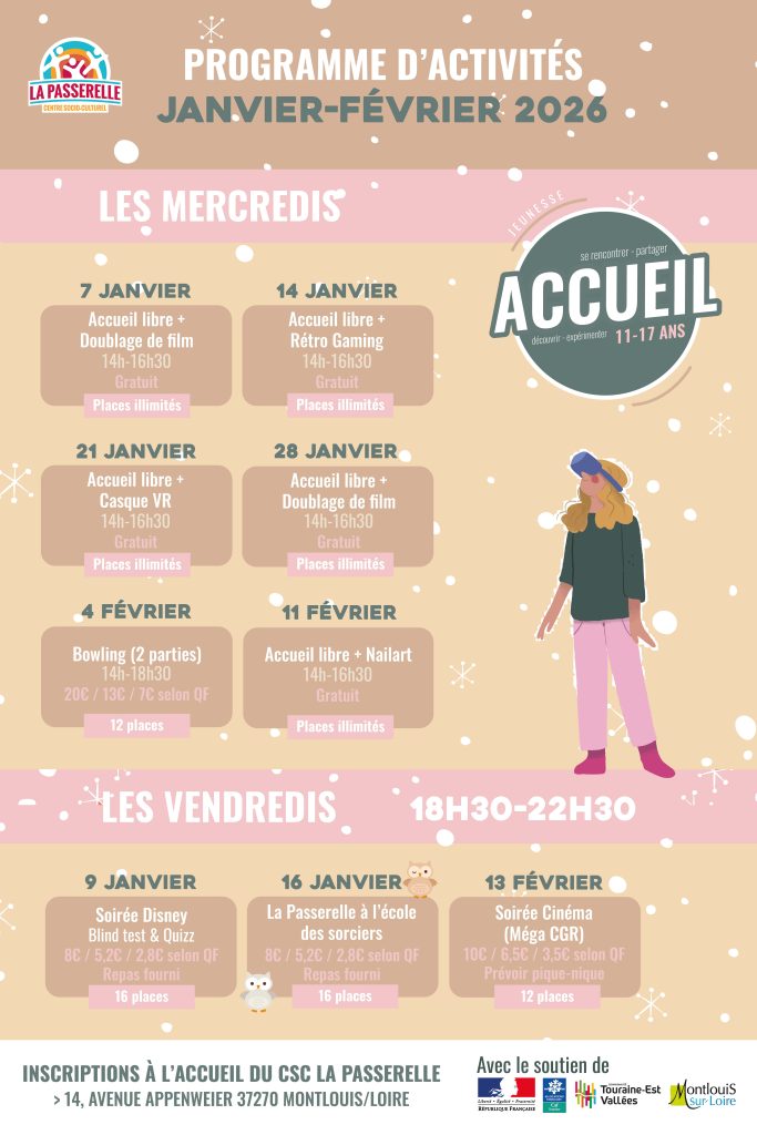 Retrouvez le programme hors vacances pour les 11-17 ans > Le mercredi, maintenant c’est accueil libre gratuit ! (sauf pour les sorties) > Inscriptions auprès de l’accueil du CSC