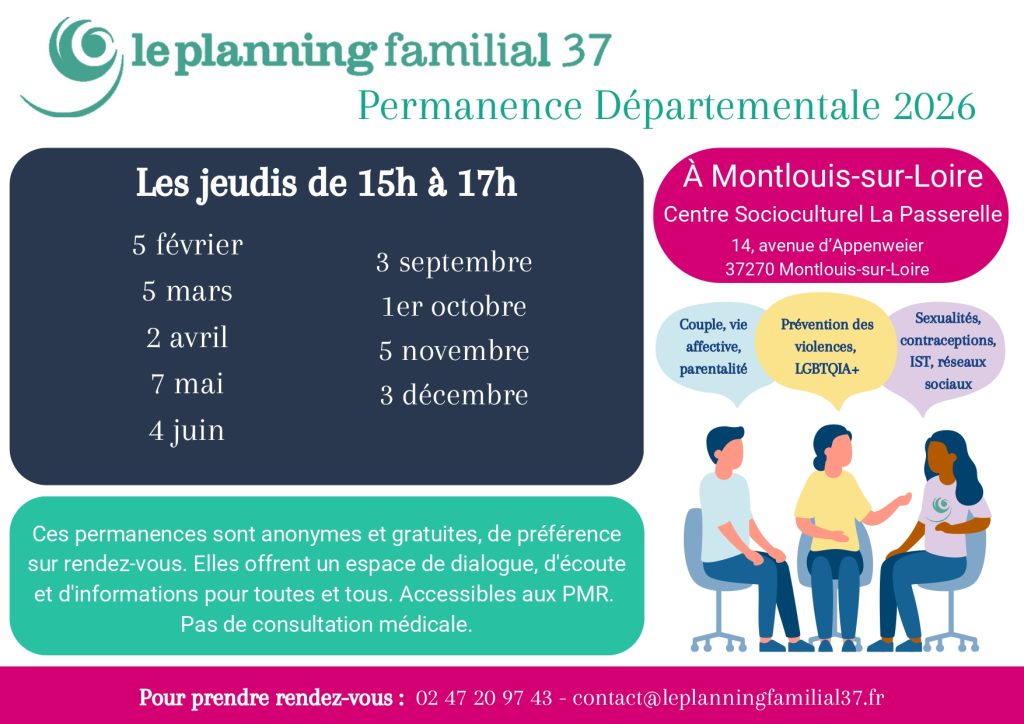 Permanences – Planning Familial 37 15 décembre 2025 À partir du jeudi 5 février 2026, retrouvez les permanences proposées par le Planning Familial 37 au CSC La Passerelle 📣