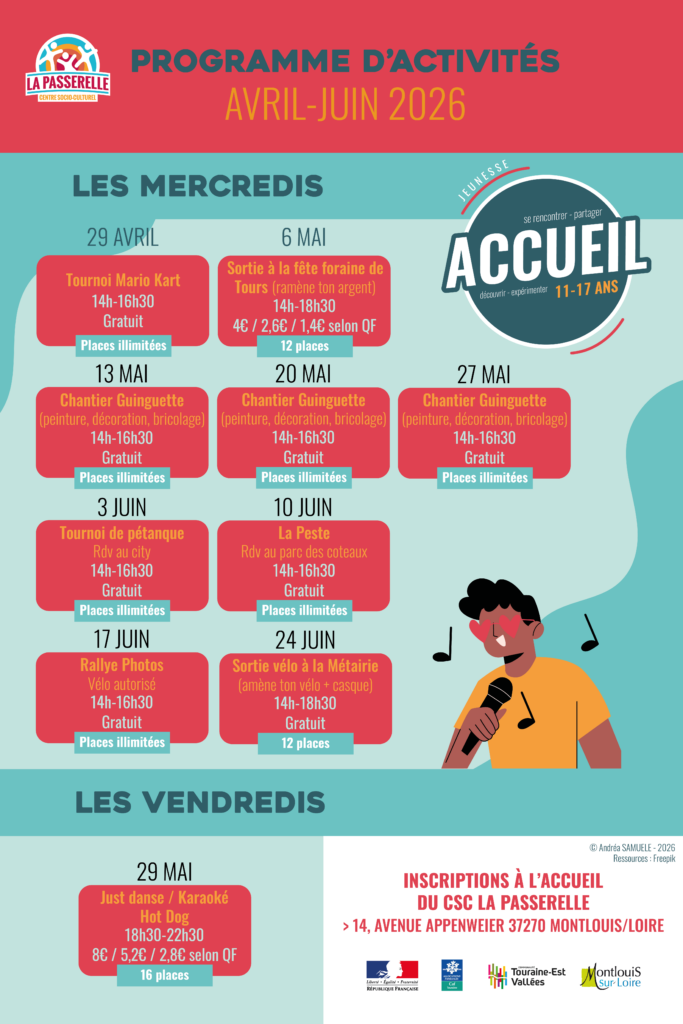 Programme d’activités avril-juin / 11-17 ans 27 avril 202627 avril 2026 Voici le programme d’activités sur la période avril-juin pour les 11-17 ans Inscriptions auprès de l’accueil du CSC La Passerelle
