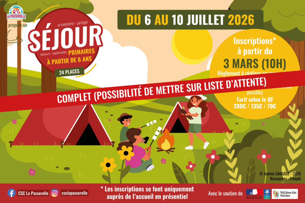 đ Ouverture des inscriptions le mardi 3 mars Ă 10h auprĂšs de l’accueil du CSC La Passerelle (prĂ©sentiel uniquement)